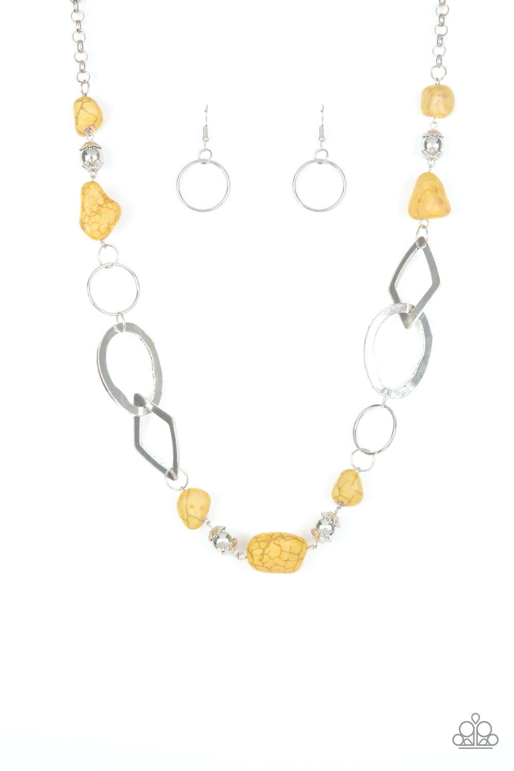 Bits of yellow stones and ornate silver beading give way to asymmetrical silver frames. The mismatched frames drape across the chest, creating an earthy collision of rock and metal. Features an adjustable clasp closure.